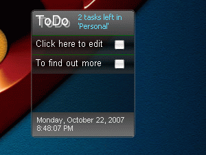 | ![]() Tabbed Todo List This gadget helps you organize your to-do tasks better by allowing you to put them into tabs / categories. That way you'll have a relevant, customizable and good looking todo list in your sidebar or on your desktop. Basically you have multiple todo lists in one! You can also export and import the content if you don't want to lose your tasks when you reinstall your system, etc.